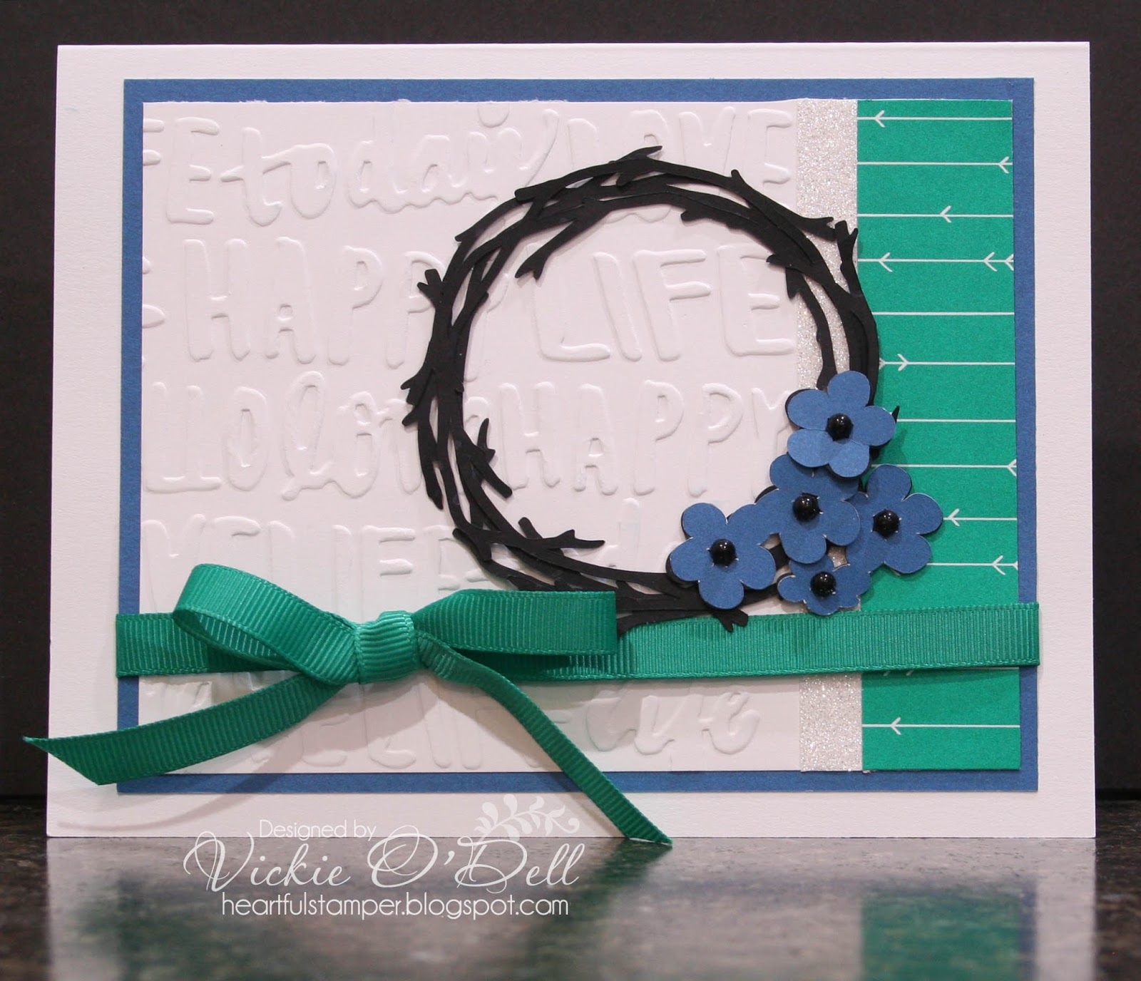 I wanted to use a couple of wreaths cut using the Cricut Flower Market cartridge. I embossed the white panel with words and had the wreath encircle the word HAPPY, LIFE was included, too. I stacked two black twig wreaths for more thickness. I cut flowers and berries for both wreaths using the same cartridge but different pages. I was going to share my cut file, but lost internet connection when I went to save and lost the file.